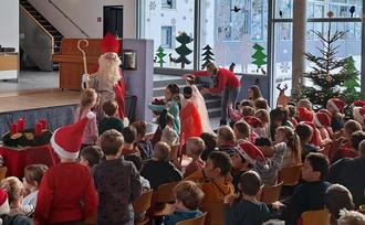 Gebannt lauschten alle Kinder der Geschichte des Heiligen Nikolaus. Viele Klassen haben sich etwas für den Nikolaus überlegt. Den Anfang machte die Klasse 1a und begeisterte mit dem traditionellen Nikolauslied „Lustig, lustig tralalala“ und Orff-Begleitung die ganze Grundschule. Weiter ging es mit der 2a, die mit Trommelbegleitung das spanische Nikolauslied „Gatatumba“ zum Besten gab. Die Partnerklasse sorgte für gute Stimmung mit einem wunderschönen Engeltanz. Zum Schluss stellte die Klasse 1c dem Nikolaus in Form eines Gedichtes noch einige Fragen.