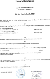 Die Gemeinde Pittenhart hat am 19.02.2026 in öffentlicher Sitzung die Haushaltssatzung der Gemeinde Pittenhart für das Haushaltsjahr 2026 beschlossen. Das Landratsamt Traunstein hat mit Schreiben vom 26.02.2026 (AZ 5.20-940-250006) diese Haushaltssatzung nebst zugehörigen Haushaltsplan für 2026 zzgl. Anlagen rechtsaufsichtlich geprüft und sein Einverständnis erteilt. Diese Haushaltssatzung samt ihren Anlagen wird bis zur nächsten amtlichen Bekanntmachung einer Haushaltssatzung in der Geschäftsstelle der Verwaltungsgemeinschaft Obing, Kienberger Str. 5, 83119 Obing (Zimmer E.05) innerhalb der allgemeinen Geschäftszeiten aufgelegt.