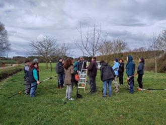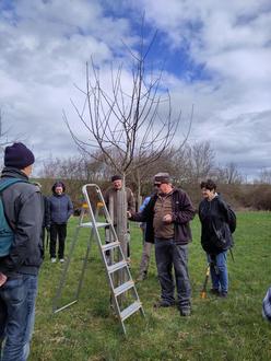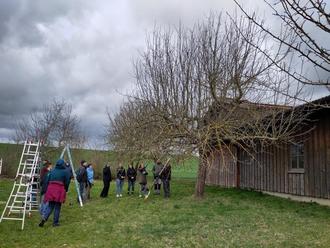 Dann ging es zu den vor vier Jahren nachgepflanzten Apfel-, Birn- und Zwetschgenbäumen. Hier zeigte Hans Schmid, wie ein damals sinnvoll vorgenommener Pflanzschnitt nun als Erziehungsschnitt weitergeführt werden kann. Es wurden gemeinsam kleinere Korrekturen vorgenommen, sodass die Jungbäume nun gute Voraussetzungen haben, um sich günstig weiter zu entwickeln. Nach einer wärmenden Kaffeepause ging es an die inzwischen über 20 Jahre alten Apfelbäume. Hier bestand ein größerer Bedarf an grundlegenden Erhaltungsschnitten. Ein Baum hatte zum Beispiel im letzten Jahr seinen Mitteltrieb durch einen Sturm verloren und es wurde erläutert, wie in so einem Fall vorgegangen werden kann. Ein anderer hatte über einige Jahre sehr viele Wassertriebe entwickelt und der Rat eines Fachmanns war hier dringend notwendig. Unter Anleitung von Hans Schmid wurden zunächst diese zwei Bäum gemeinsam in Form gebracht, wobei es günstiger ist, eher größere Äste herauszunehmen, als zuviel am Kleinästigen herumzuschneiden, wie Hans Schmid erklärte. Auch sollte vor Beginn des Schnittes der Baum gut in die Anschauung gebracht werden und überlegt werden, wie sich der Baum günstig weiterentwickeln kann. Danach wurde in Gruppen das Erlernte an weiteren Bäume angewendet. Die Teilnehmer hatten viel Freude beim miteinander Beratschlagen und das gelernte anzuwenden. Sie scheuten sich auch nicht davor, in die Bäume zu klettern, damit auch an die höher gelegeneren zu schneidenden Äst gut erreicht wurden. Bei allen Schnittempfehlungen stand sowohl ein guter, gesunder Ertrag als auch eine natürliche Formgebung und Formentwicklung in der Aufmerksamkeit. Weiterhin wurden auch die unterschiedlichen Schnittwerkzeuge besprochen und ausprobiert und so mancher hat festgestellt, dass das eigene Werkzeug durchaus erneuert werden könnte. Zum Abschluss erhielt jeder Teilnehmer von Heidrun Zeller, die den Kurs organisiert und begleitet hat, zur weiteren Wissensvertiefung eine kleine Zusammenstellung mit fachbezogenen Merkblätter des Obst- und Gartenbauverlages. Die Teilnehmer waren sich einig, dass der Kurs sehr interessant war und dass viel gelernt werden konnte. Das schlecht prognostizierte Wetter hielt bis zum Ende des Kurses durch und es kamen nach kurzen Nieselschauern sogar einige Sonnenstrahlen durch die Wolkendecke. Zum Abschluss bedankte sich Heidrun Zeller bei Hans Schmid sehr herzlich für die Leitung des Kurses und den lehrreichen Vormittag und wünschte allen Teilnehmern viel Erfolg beim Obstbaumschneiden im eigenen Garten.