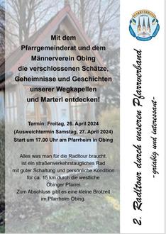 Kienberg: Die Kienberger Pfarrangehörigen möchten dieses Jahr wieder die Wallfahrt nach Maria Eck am 01.05.24 mit dem Bus unternehmen, sofern bis spätestens 28.04. ausreichend Anmeldungen in der Sakristei oder bei Liesi Unterauer eingehen. Abfahrt ist um 9:00 Uhr in Kienberg. Der Gottesdienst findet bei gutem Wetter im Freien um 10:15 Uhr statt. Tel. Anmeldung bei Elisabeth Unterauer Tel. 08628 242