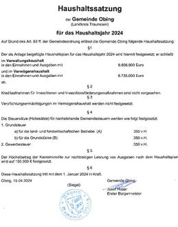 „Die Gemeinde Obing hat am 19.03.2024 in öffentlicher Sitzung die Haushaltssatzung der Gemeinde Obing für das Haushaltsjahr 2024 beschlossen. Das Landratsamt Traunstein hat mit Schreiben vom 15.04.2024 (AZ 3.20-941-230005) diese Haushaltssatzung und den zugehörigen Haushaltplan für 2024 nebst Anlagen rechtsaufsichtlich geprüft und sein Einvernehmen erteilt. Genehmigungspflichtige Bestandteile sind nicht enthalten. Die Haushaltssatzung 2024 samt ihren Anlagen wird bis zur nächsten amtlichen Bekanntmachung einer Haushaltssatzung in der Geschäftsstelle der Verwaltungsgemeinschaft Obing, Kienberger Str. 5, 83119 Obing (Zimmer O.05) innerhalb der allgemeinen Geschäftsstunden aufgelegt.“