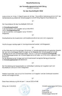 Die Verwaltungsgemeinschaft Obing hat am 10.03.2025 in öffentlicher Sitzung die Haushaltssatzung für das Haushaltsjahr 2025 beschlossen. Das Landratsamt Traunstein hat mit Schreiben vom 10.04.2025 (AZ VG-941) diese Haushaltssatzung nebst zugehörigen Haushaltsplan für 2025 rechtsausfsichtlich geprüft und sein Einverständnis erteilt. Genehmigungspflichtige Bestandteile sind nicht erhalten. Diese Haushaltssatzung samt ihren Anlagen wird bis zur nächsten amtlichen Bekanntmachung einer Haushaltssatzung in der Geschäftsstelle der Verwaltungsgemeinschaft Obing, Kienberger Str. 5, 83119 Obing (Zimmer E.05) innerhalb der allgemeinen Geschäftszeiten aufgelegt.