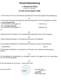 Die Gemeinde Obing hat am 18.03.2025 in öffentlicher Sitzung die Haushaltssatzung der Gemeinde Obing für das Haushaltsjahr 2025 beschlossen. Das Landratsamt Traunstein hat mit Schreiben vom 14.04.2025 (AZ K.20-940-240009) diese Haushaltssatzung nebst zugehörigen Haushaltsplan für 2025 zzgl. Anlagen rechtsaufsichtlich geprüft und sein Einverständnis erteilt. Diese Haushaltssatzung samt ihren Anlagen wird bis zur nächsten amtlichen Bekanntmachung einer Haushaltssatzung in der Geschäftsstelle der Verwaltungsgemeinschaft Obing, Kienberger Str. 5, 83119 Obing (Zimmer E.05) innerhalb der allgemeinen Geschäftszeiten aufgelegt.