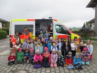 Anhand von Geschichten wurden Unfallmaßnahmen besprochen und die Kinder lernten einen Notruf abzusetzen. Zusätzlich wurde geübt, wie Wunden versorgt werden, wir die stabile Seitenlage funktioniert und mit großem Interesse konnte der Krankenwagen besichtigt werden, der uns mit Blaulicht besucht hat.