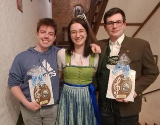 Mit einem kleinen Präsent beglückwünschte Jugenddirigentin Johanna Weindl die beiden Jung-Musiker Lucas Pausan und Kilian Zunhammer zur erfolgreichen Ablage des Musikabzeichens D1 in Bronze.