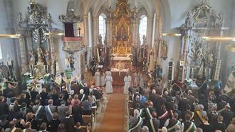 Einen festlichen Anblick vermitteln die Fahnen der Ortsvereine im Altarraum und seitlich im Kirchenschiff die aufgereihten Fahnen der Schützenvereine und die, bis auf den letzten Platz besetzen Stuhlreihen mit den ganzen Schützenkönigen und den Schützinnen und Schützen in ihren schönen Vereinstrachten. Pfarrer David Mehlich zelebrierte den feierlichen Gottesdienst, der von „Chiemgauer Seitenklang“ und dem Pittenharter Kirchenchor musikalisch mit den Liedern der Bauernmesse von Annette Thoma begleitet wurde.