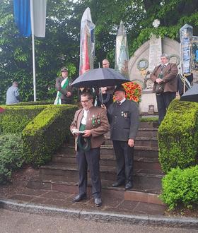 Im Anschluss an den Gottesdienst ging es zum Kriegerdenkmal. Nach den Gebeten und dem christlichen Segen ergriff erster Gauschützenmeister Bernhard Brehmer das Wort und erinnerte an alle verstorbenen und vermissten Mitglieder. Ihnen zu Ehren und zum Dank wurde mit den Klängen „zum guten Kameraden“ und mit Salutschüssen ein Kranz niedergelegt.