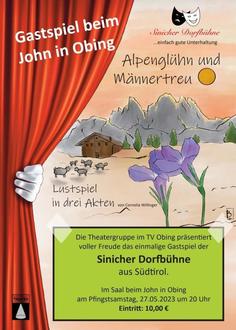 Die Theatergruppe im TV Obing freut sich, ein einmaliges Gastspiel unserer Freunde von der Dorfbühne aus Sinich bei Meran auf unserer Bühne im Saal beim John präsentieren zu können. Zur Aufführung kommt am Pfingstsamstag, 27.5. 2023 um 20 Uhr das Lustspiel in drei Akten