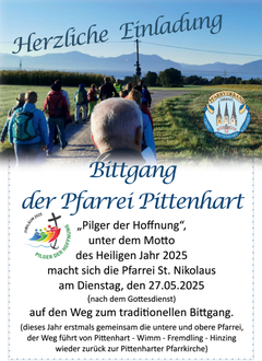 An der Kapelle in Fremdling werden die Gebete zur 3. Station „Weitergehen“ gesprochen, ehe es dann Richtung Hinzing weitergeht. Die Kapelle in Hinzing bietet Platz und Raum für die Gebete und Lieder der 4. Station „Hoffnung“. Dann geht es zurück zur Kirche, der 5. Station „Ankommen“. Die Bitten um Schutz vor Blitz, Hagel, Unwettern und Katastrophen, um Wachstum von Früchten auf Fluren und in Gärten, werden in die Rosenkranzgebete eingefügt, die während des Bittganges gebetet werden. Die ganze Pfarrgemeinde ist herzlich dazu eingeladen und gerade im Heiligen Jahr, das unter dem Motto „Pilger der Hoffnung“ steht, ein guter Anfang, dem Pittenharter Bittgang auch wieder mehr Leben einzuhauchen.