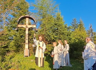 Mit einem Marienlied singend gings im Anschluss der Andacht an der kleinen Waldkapelle, zum nahe gelegenen Pestkreuz, dass beim Unwetter 2021 zu Schaden kam. Wie durch ein Wunder blieb das fast hundert Jahre alte Kreuz in Mitten der umgestürzten Bäume stehen. Mitarbeiter des Bauhofes bauten das Kreuz ab, das Eichenkreuz und die gusseiserne Christusfigur wurden restauriert und das beschädigte Kupferdach repariert. Im Herbst 2024 wurde das über drei Meter hohe Kreuz von den Mitarbeitern des Bauhofes und den Bergfreunden Obing wieder aufgestellt und strahlt seitdem im neuen Glanz, in der durch den Sturm 2021 entstandenen Waldlichtung. Pfarrer David Mehlich spendete dem renovierten Mahnmal den christlichen Segen und das Kreuz soll auch bei den künftigen Generationen die schreckliche Krankheit der Jahre 1634 – 1635 und ihre Folgen für die Heimat nicht in Vergessenheit geraten lassen.