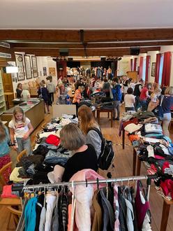 Es wurden viele hochwertige Kleidungsstücke gespendet, die dann nach Größen sortiert auf ihre neuen Abnehmer warteten. Besonders hilfreich war dafür das Inventar des Kinderkleidermarkts, um die schönen Stücke gut präsentieren zu können. Bei Musik und guter Laune suchten die Besucher sich im vielfältigen Angebot neue Teile aus und freuten sich, wenn ihre mitgebrachten Teile einen neuen Besitzer fanden. Dass ca. die Hälfte der Teile einen neuen Besitzer fand, zeigt dass die Besucher das Angebot schätzten und dass gebrauchte Kleidung immer noch einen Wert hat.