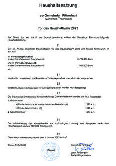 „Die Gemeinde Pittenhart hat die Haushaltssatzung für das Haushaltsjahr 2023 am 23.03.2023 beschlossen. Mit Schreiben vom 07.06.2023 hat das Landratsamt Traunstein diese Haushaltssatzung nebst Anlagen geprüft und fachaufsichtlich ohne Einwendungen gewürdigt. Die Haushaltssatzung samt ihren Anlagen wird bis zur nächsten amtlichen Bekanntmachung einer Haushaltssatzung in der Geschäftsstelle der Verwaltungsgemeinschaft Obing, Kienberger Straße 5 (Zimmer E.05) innerhalb der Geschäftsstunden aufgelegt.“