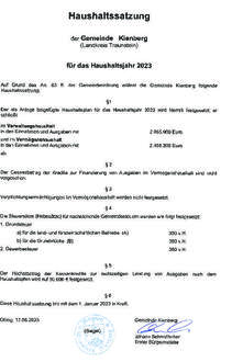 „Die Gemeinde Kienberg hat die Haushaltssatzung für das Haushaltsjahr 2023 am 09.03.2023 beschlossen. Mit Schreiben vom 07.06.2023 hat das Landratsamt Traunstein diese Haushaltssatzung nebst Anlagen geprüft und fachaufsichtlich ohne Einwendungen gewürdigt. Die Haushaltssatzung samt ihren Anlagen wird bis zur nächsten amtlichen Bekanntmachung einer Haushaltssatzung in der Geschäftsstelle der Verwaltungsgemeinschaft Obing, Kienberger Straße 5 (Zimmer E.05) innerhalb der Geschäftsstunden aufgelegt.“