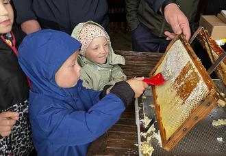 Der Bienenzuchtverein Schnaitsee besuchte die lustigen Gießkannenräuber- die Kindergruppe des GBV Kienberg. Den rund 15 Kindern wurde die Bienenbeute erklärt, das Leben einer Biene veranschaulicht und alle durften im Bienenwagen sogar eine Biene auf die Hand nehmen. Die Begeisterung war riesig. Ein Highlight des Besuchs war das Entdeckeln der Honigwaben und das Schleudern des eigenen Honigs. Jedes Kind durfte zum Schluss ein Honigbrot mit eigenem Honig essen und ein Glas Honig mit nach Hause nehmen. Alle Kinder waren sehr beeindruckt. Der Besuch des Bienenzuchtvereins Schnaitsee war ein voller Erfolg.