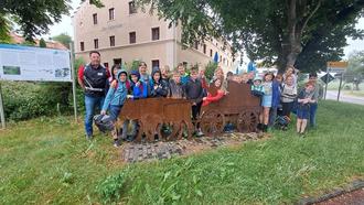 Der Ausflug führte zu verschiedenen Stationen in und um Pittenhart. Zu Beginn bekam die Schulklasse das Standbild des Benefiziariers samt seiner Gattin, sowie den Weihestein am Friedhof erklärt. Anschließend ging es zum nachgebauten Ochsenfuhrwerk, dass sich vor dem Landgasthof „Alte Zollstation“ befindet. Das Gespann ist ein wichtiges Symbol für Handel, Verkehr und Verwaltung in der römischen Provinz Noricum, so hieß unsere Gegend damals. Eine Schülerin hielt freudestrahlend die Zügel und Peitsche in den Händen, wie man auf dem Foto gut sehen kann. Nach einer Pause im Landgasthof führte der Weg zum keltischen Opferplatz auf dem Höhenberg. Anschließend konnten die Kinder den möglichen Standort des römischen Gutshofes (Villa Rustica) in der Nähe der Franziskuskapelle bei Oberbrunn entdecken. Danach wurde die römische Straße, die von Seebruck aus in direkter Richtung über Windschnur nach Pittenhart führt, besichtigt und ihre Bedeutung erklärt. In Oberbrunn ist für die Kinder ein kleines Stück der Römerstraße mit original Basaltsteinen nachgebaut worden. Auf dem Rückweg über Niederbrunn und Straßberg wurde wieder ein Stück auf der alten Römertrasse nach Pittenhart gegangen. Voller Eifer waren die Kinder dabei und hatten viele Fragen an Herrn Buchner, ehe am Schulhof die beeindruckende Wanderung ihren schönen Ausklang fand.