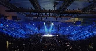 Um 19.00 Uhr stiegen Spannung und Nervosität bei allen ins Unermessliche. Viele Eltern wollten sich den Auftritt ihrer Kinder nicht entgehen lassen und hatten sich Tickets für das Konzert besorgt. Fabian Sennholz startete mit seiner Band auf der Bühne und zwischen den Chorkindern verteilt das Konzert. Bereits das Eingangslied wurde von den Zuschauern mit Riesenapplaus und Jubelrufen belohnt. Dabei war dies nur der Anfang. Jedes Lied löste bei den Zuschauern Begeisterungsstürme und verschiedenste Emotionen wie Freude, Euphorie, Gänsehaut, aber auch Tränen der Rührung aus. Jeder Act wurde mit tosendem Applaus des Publikums belohnt. Die Kinder sangen und tanzten begeistert die erlernten Lieder und Choreographien. Ausgelassene Partystimmung herrschte bei „Wir sind united!“, „Bleiben wir“ und „Strip“. Gänsehaut erzeugten die stimmungsvollen Arrangements von „Taivas on sininen“, „Ave Maria“, „Wunderfinder“ oder „Der Mond ist aufgegangen“. Anspruchsvolle Tanzschritte und Choreographien mit Tüchern beeindruckten die Zuschauer bei „San Antonio“, „Was du nicht sagst“ und „Weiße Fahnen“. Zwischendurch heizten die Musiker mit ihrem Bandmedley den Zuschauern, aber ebenso auch den 6000 Chorkindern ein und die Stimmung war am Kochen. Schon zu Hause war für viele Kinder das Medley „Das Beste in dir“ das Highlight aller Stücke. Als dann während des Liedes auch noch der Sänger und Radiomoderator Sascha Seelemann als Überraschungsgast zwei seiner Hits live mitperformte, hielt es niemanden mehr auf seinen Sitzen. Nach der grandiosen Zugabe „Kinder an die Macht“ ging die 90-minütige Show zu Ende und die Chöre wurden mit minutenlangem Applaus und Standing Ovations verabschiedet.
