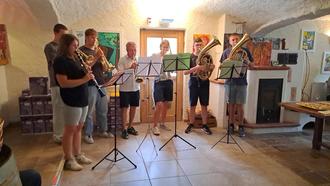 Für den musikalischen Rahmen sorgte die Bläsergruppe der Mittelschule Obing, unter Leitung von Jakob Lauber mit sehr beschwingten Klängen und wie Thomas Duxner, Leiter der Grund- und Mittelschule Obing (GMS) eingangs verkündete, sei von den vielen Besuchern am heutigen Nachmittag Durchhaltevermögen gefordert, denn die Musik, die vielen Lehmann-Bilder an den Wänden, die leckeren Häppchen, Prosecco, Saft, und Wein versprechen einen schönen Nachmittag in den gemütlich gestalteten Räumen des Fiehrerhofes. Von den Schülern der GMS Obing wurden sehr einladende Platten mit allerlei süßen und herzhaften Köstlichkeiten vorbereitet. Doris Rotter, die Inhaberin von „Weine am Fiehrerhof“ lud die Besucher zu einem Glas Prosecco ein.