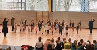 Danach verabschiedete sich die erste Gruppe und gab den Tanzboden für die Gruppe der sechs- bis neunjährigen Mädchen frei. Diese führten ohne ihre Trainerin eine flotte Choreographie zu dem Lied „Echte Freunde“ aus dem Film „Die Schule der magischen Tiere“ vor. Mit Gesten, unterschiedlich schnellen Schrittkombinationen und variativen Armbewegungen stellten sie dessen Inhalt dar. Ebenso tanzten sie – diesmal mit Unterstützung ihrer Trainerin – zu „Ich bin bereit“ aus dem Film „Vaiana“. Bei ihrer letzten Darbietung wurden sie von der dritten Gruppe unterstützt. Über 40 Kinder zeigten zur Titelmusik von „Games of Thrones“ ein Übungslied der Füße.