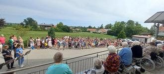 Der Aktionstag begann - nach morgentlichem Regenschauer pünktlich zu Beginn mit Sonnenschein - gemeinsam auf der Tribüne vor der Sporthalle mit der Bläserklasse der Mittelschule und dem Obinger Schullied. In einleitenden Worten betonte Schulleiter Duxner die Freude, die Musik versprüht, wenn wie am heutigen Tag gemeinsam musiziert wird und andere dies genießen können. Er bedankte sich bei der Organisatorin Gertrud Schwoshuber, die mit großer Genauigkeit den Ablauf und die Elemente des Musiktags zusammengestellt hat. Anschließend wurden an vier Stellen im Ort Lieder und Aufführungen dargeboten. Zunächst konnte Bürgermeister Huber mit seinen Mitarbeiterinnen und Mitarbeitern eine kurze Auszeit von der Arbeit musikalisch genießen. Danach wurde in der Kirche gesungen und zum Josefihof weitergezogen. Dort war es nach Aussage der Einrichtungsleitung erneut ein Highlight des Jahres, dass die Kinder so viele und auch alte Lieder gesungen haben, die den Bewohnern aus deren Kindheit bekannt waren. Den Abschluss bildete die Eisdiele, vor der das "Eisdielenlied" angestimmt wurde. Vom Bürgermeister wurden alle Kinder zu einem Eis eingeladen. Eine süße Abkühlung am ereignisreichen Musiktag!