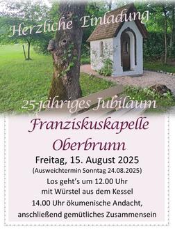 Den Auftakt der Feier macht um 12.00 Uhr ein gemeinsamer Mittagstisch, zu dem es Würstel aus dem Kessel gibt. Für das leibliche Wohl wird mit Getränken, Kaffee und Kuchen bestens gesorgt, der Erlös aus dem Verkauf von Speisen und Getränke wird für den Unterhalt der Kapelle verwendet. Die Oberbrunner laden den gesamten Pfarrverband Obing, die Nachbarn und Freunde der Franziskuskapelle herzlich zum 25-jährigen Jubiläum ihrer Kapelle ein und freuen sich auf einen sonnigen, fröhlichen Tag.