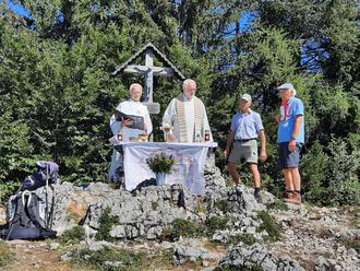 Bei der Bergmesse am Pittenharter Kreuz (v.r. Hans Bruckner, Englbert Vodermaier, Pater Joachim Sachse aus Maria Eck, Diakon Sepp Stürzer)