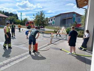 Cool bleiben, wenns brenzlig wird- beim diesjährigen Ferienprogramm unter dem Motto "Erlebnistag bei der Feuerwehr Obing“ war für die rund 50 Kinder im Alter von drei bis zwölf Jahren einiges geboten. In lockerer Atmosphäre bekamen sie einen Einblick in die Arbeit der freiwilligen Feuerwehr und durften auch selbst Hand anlegen. Sie konnten u. a. den richtigen Umgang mit dem Feuerlöscher und auch ihr Geschick mit der Kübelspritze beim Umspritzen von Kübeln üben. Mit der Drehleiter konnten sie Obing in schwindelerregender Höhe bestaunen, ehe sie mit dem Tanklösch- bzw. Löschgruppenfahrzeug eine Runde im Ortsgebiet drehen durften. Bei einer Vorführung erlebten die Kinder hautnah, was passiert, wenn man einen Fettbrand mit Wasser löscht. Zudem bewies die Jugendgruppe den Teilnehmerinnen und Teilnehmern des Ferienprogramms bei einer Schauübung "Person unter Gegenstand eingeklemmt" ihr Können.“
