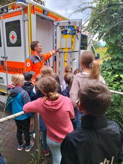 Die Kursteilnehmer wurden vom Pfarrgemeinderat mit Getränken, einer Brotzeit, Obst und Kuchen versorgt. Den Abschluss bildete dann unvorhergesehen ein echter Einsatz, weil in Haslach eine Fliegerbombe gefunden worden war und Herr Seifert dazu gerufen wurde. So konnten die Kinder auch noch sehen, wie der Rettungswagen mit Blaulicht Richtung Traunstein losfuhr.