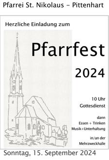 Der Pittenharter Pfarrgemeinderat lädt die ganze Pfarrgemeinde herzlich zum Pfarrfest am Sonntag, 15. September ein. Beginn ist um 10 Uhr mit einem Gottesdienst in der Pfarrkirche, in dessen Rahmen auch die neuen Ministranten eingeführt werden.