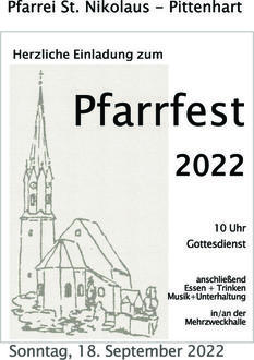 Der Pittenharter Pfarrgemeinderat lädt die ganze Pfarrgemeinde herzlich zum Pfarrfest am Sonntag, 18. September ein. Beginn ist um 10 Uhr mit einem Gottesdienst in der Pfarrkirche. Anschließend wird um die Mehrzweckhalle (bei schlechtem Wetter in der Halle) bei Musik, Mittagessen sowie Kaffee und Kuchen weiter gefeiert. Um Kuchenspenden wird gebeten. Die Kinder dürfen sich auf ein Schattentheater und Kinderschminken freuen. Für die musikalische Unterhaltung sorgt die Musikinitiative Pittenhart und auch die Trachtenkinder tragen mit Tanz und Gesang zum Programm bei.