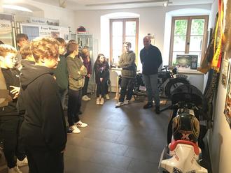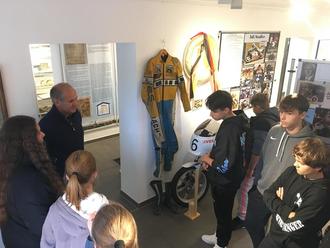 Am 19. September nahm Schulleiter Duxner die Möglichkeit wahr, im Rahmen des "Natur und Technik"-Unterrichts der 8. Klassen zum Thema "Energieformen bei der motorisierten Fortbewegung" dem Heimatmuseum Obing einen Besuch abzustatten. Heimatpfleger und Initiator der Ausstellung "Obinger Motorrad-Rennfahrer-Legenden" Ludwig Bürger begrüßte die erste von zwei Schülergruppen und wies auf die Bedeutung des örtlichen Museums hin. Adi Stadler, ehemaliger Motorradprofi und international erfolgreicher Sportler und Koordinator im Motorradsport hat dann die Jugendlichen die Besonderheiten im Motorradsport erläutert. Die außergewöhnliche Stellung Obings mit den wohl meisten Motorradsportlern aus einem Ort in Deutschland hat die Schülerinnen und Schüler beeindruckt. Stadler hat seinen sportlichen Werdegang interessant geschildert und die Funktionsweise des Viertakt-Motors am Beispiel der 1924er AJS von Karl Freilinger erklärt. "An diesem Motor kann man alle Bauteile des Motors ganz deutlich erkennen. Heute dominiert Elektronik und Modulbauweise. Auch der Beruf des KfZ-Mechanikers hat sich - wie viele Ausbildungsberufe - zur Elektronik verschoben." so Stadler. Den Jugendlichen der Klasse 8a und 8bm hat der Lernort im Dorf gefallen. "Nächstes Thema im Unterricht ist nun die Elektromobilität und deren Bedeutung für die Zukunft", schloss Duxner den Besuch ab.