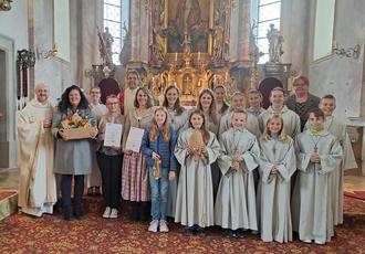 Seit ihrer Erstkommunion bereiten sich zwei Mädchen, Emma Zunhammer und Eva Maria Fuchs vor, um als Ministranten in die Gemeinschaft genommen zu werden. Vor Pfarrer Mehlich abgelegten ihr Versprechen der Pünktlichkeit und Zuverlässigkeit ab, bevor ihnen ihr Ministrantenkreuzerl umgelegt wurde.