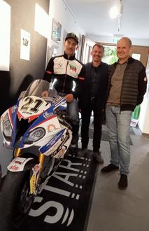 Am Eröffnungstag der Ausstellung im Obinger Heimatmuseum: Markus Reiterberger auf seiner BMW S1000RR von 2017 mit Bürgermeister Sepp Huber und Rennfahrerkollegen Adi Stadler