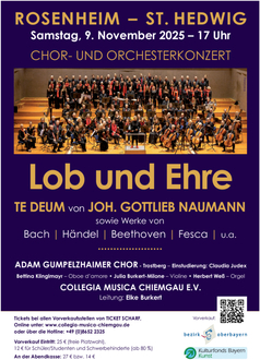 Die Collegia Musica Chiemgau e.V. aus Obing und der Adam-Gumpelzhaimer-Chor aus Trostberg präsentieren am Sonntag, den 9. November 2025, 17:00 Uhr in der Kirche St. Hedwig (Austr. 36, Rosenheim) unter der Leitung von Elke Burkert festliche Werke von Händel, Bach, Beethoven, Fesca, Paer und Naumann.