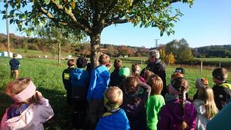Über die Bayerische Landesanstalt für Landwirtschaft wurden den Klassen 1a, 1b, 2a und 2b kostenfreie Natur-Führungen mit Christa Weiss aus Pfaffing zum Thema Obst und Streuobstwiese genehmigt. Die Klassenleiter wählten hierfür das Kulturgut um den „Hilgerhof“ in Niederbrunn aus. Der Bürgermeister und zugleich Vorstand des Kuturvereins Hilgerhof e. V., Sepp Reithmeier erlaubte uns den Aufenthalt auf dem ehrwürdigen Hof. Ziel der Aktion „Streuobst“ ist es, den kulturellen und ökologischen Wert der Streuobstwiesen zu vermitteln sowie die Vielfalt regionaler Produkte aus den Streuobstwiesen aufzuzeigen. Hierzu trafen sich die vier Klassen mit Frau Weiss zeitversetzt. Man marschierte gemeinsam auf die Streuobstwiese und erschloss mit den Erstklässlern den Begriff. Die ausgebildete Naturführerin ging neben der Anordnung des Bewuchses vor allem auf die hochstämmigen Apfel-, Birnen-, Kirsch-, Zwetschgen- und Nussbäume ein, die eine heimische, mittlerweile selten gewordene Streuobstwiese ausmachen. Wichtig zum Begriff Wiese waren die Blumen und ihre Besucher, die Bienen, die zum Großteil ausschlaggebend für die Befruchtung der Blüten sind. Gleich nebenan befindet sich deshalb ein Bienenhaus. Zur Inspektion der Bäume wurden die Kinder ausgeschickt. Hernach wurden alle gefundenen Auffälligkeiten gemeinsam begutachtet und besprochen.