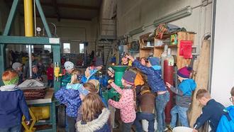 Bei einem weiteren Ausflug zum Thema Apfel ging es zum Saft-Pressen. Bei den Familien Hell, Stöcklhuber, Vodermaier und Voit durften die Grundschüler Hand anlegen, indem sie die Falläpfel sowie Birnen sammelten, in den Häcksler warfen und in die Presse umfüllten. Gespannt beobachteten sie wie reichlich Saft floss.