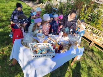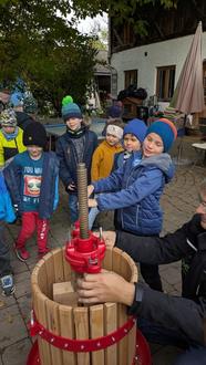 Dann ging es ans Werk: Gemeinsam durften die Kinder Äpfel ernten, waschen und die Erwachsenen diese schneiden. Mit viel Kraft wurden die Stücke in einer handbetriebenen Walze zerkleinert und anschließend gepresst. Jedes Kind durfte mit anpacken - gar nicht so einfach, aber der Einsatz lohnte sich! Schon bald duftete der erste Topf voller frisch gepresstem Apfelsaft herrlich süß.