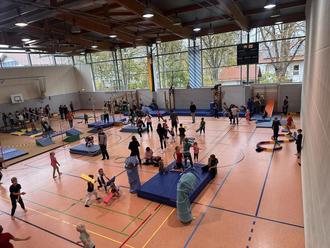 Während in Halle 1 vorwiegend ältere Kinder und auch Jugendliche ihre Kräfte und motorischen Fähigkeiten auf dem Parcour erprobten, fand in Halle 2 ein abwechslungsreiches Programm aus Spiel- und Workout-Angeboten statt, in dem für jede Altersgruppe etwas zu finden war. So nahmen beispielsweise ganze Familien an den angebotenen Laufspielen teil. Zahlreiche Mütter und Väter nutzten mit ihren Kindern die herbstliche Turnstunde für kleinere Kinder, die liebevoll von den Trainerinnen des Eltern-Kind-Turnens Selina Ober und Nici Mayer gestaltet wurde.