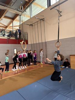 Den absoluten Besuchermagneten stellten jedoch die so genannten „Travelling Rings“ dar. Hierbei handelt es sich um eine Hangelstrecke aus vier Ringen in großem Abstand. Durch Schwingen von Ring zu Ring gelangt man von einer auf die andere Seite. Wie Tarzan an den Lianen schwangen die Kinder immer und immer wieder von Ring zu Ring - mal erfolgreich, mal nicht - und stellten sich wieder in die lange Warteschlange vor den „Travelling Rings“, bis sie es erneut versuchen durften. „Diese Bewegungsvariante an den Ringen ist auch immer ein Renner im Hallentraining“, so Leichtathletik-Trainerin Simone Koenig. „Allerdings auch ein Garant für einen ordentlichen Muskelkater.“