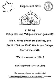 Obing/Albertaich. Es ist wieder soweit – auch dieses Jahr brauchen wir möglichst viele junge Helfer, die sich für arme und benachteiligte Kinder und Jugendliche unserer Welt einsetzen. Die erste Probe der Sternsinger findet am Freitag, den 29. November um 16.00 Uhr im Pfarrheim in Obing statt. Herzlich eingeladen sind alle Jugendlichen und Kinder ab der dritten Klasse. Neue Gesichter sind immer willkommen.