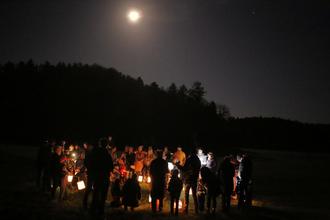 Beleuchtet wurde der Weg von zahlreichen Kerzenlichtern und einem strahlend hellen (fast) Vollmond. An insgesamt 4 Stationen wurde angehalten, um Laternenlieder zu singen. Der Zug endete wie in den Vorjahren bei Anni Voit unter ihrem imposanten Nussbaum. Dort konnten alle bei Punsch und Schnittlauchbrot am Lagerfeuer einen stimmungsvollen Abend genießen.
