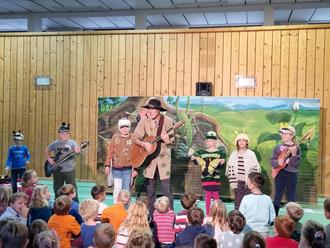 Nach einer langen Pause besuchte der Liedermacher Toni Tanner die Schüler und Schülerinnen der Grundschule Kienberg-Peterskirchen. Diesmal verzauberte er die Kinder mit seinem musikalischen Mitmachmärchen „Käfer & Co I … wenn sich zwei streiten“. Toni Tanner entführte die Kinder als „Waldschrat“ auf die Wiese im Bergwald und erzählte gemeinsam mit Kindern, die sich freiwillig als Schauspieler meldeten, die Geschichte von Rita Raupe, die neu in die Klasse der Insektenschule kam. Sie hatte keinen guten Start und wurde von Kurt Käfer und seinen Freunden fertig gemacht.