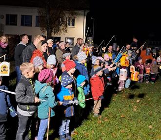 Unzählige brennende Windlichter am Straßenrand säumten bei beginnender Dunkelheit den Weg des Martinszuges durch das Dorf. Ein langer Zug der Kinder, die stolz ihre bunten Laternen vor sich hertrugen, machte sich in Begleitung von Eltern, Geschwistern und Großeltern vom Vorplatz des Kindergartens aus in Richtung Wappachstraße auf den Weg.