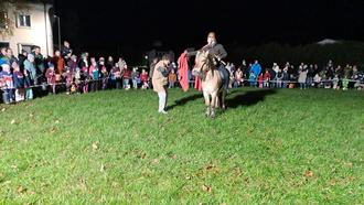Während der Heilige Martin (Celina Flemm) der Geschichte nach ein Soldat auf einem Pferd (das vom Mörnerhof in Kienberg stammt) um das brennende Lagerfeuer ritt, tauchte plötzlich aus dem Dunkeln ein frierender Bettler (Lorenz Canstein) auf.