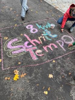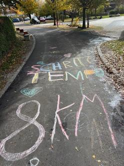 Um auf die Bedeutung dieses Schutzbereichs hinzuweisen, haben die Schülerinnen und Schüler bunte Kunstwerke auf der Straße gestaltet. Sie setzen damit ein klares Zeichen für mehr Aufmerksamkeit und Sicherheit.