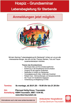 Anmeldungen unter Tel. 086169495 beim Kath. Kreisbildungswerk Traunstein. Weitere Informationen sind auch beim Ambulanten Hospizdienst Caritas Traunstein unter Tel. 086198877920 erhältlich.