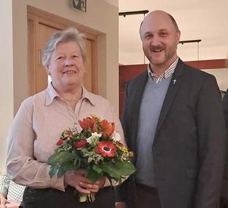 Eine Sache beeindruckt den Pfarrer besonders, so dass er die Geschichte erzählt, wie bei der Fronleichnamsprozession das gewachsene Zusammenspiel zwischen Kirchenpfleger Englbert Vodermaier, Messnerin Simone Klauke und Kanonier Markus Weindl funktioniert und nach dem Segen die Glocken läuten und der Schuss rechtzeitig losgeht. Das Zusammenspiel hat bestens in der Messnerei funktioniert. Resi Eder hat jahrelang ehrenamtlich ausgeholfen und bei den Messnern den Rücken freigehalten, dafür erhält sie einem Blumenstrauß.