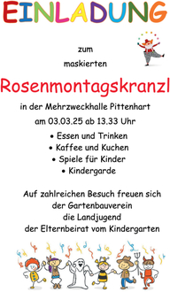 Der Gartenbauverein bittet für das Rosenmontagskranzl in der Mehrzweckhalle am 03.03.25 um zahlreiche Kuchenspenden.