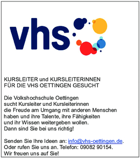 Die Führung finden am Sonntag, den 16.06.24 14:00 - 15:30 Uhr in Gunzenhausen statt. Anmeldungen zu den Kursen im Büro der vhs Oettingen unter der Telefonnummer 09082 90154 oder über die Homepage www.rieser-volkshochschulen.de.