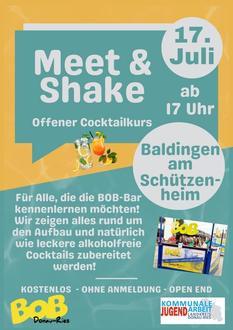 Eingeladen sind am 17. Juli ab 17 Uhr alle Interessierten zum „Meet & Shake“ nach Baldingen ans Schützenheim. Die Aktion BOB stellt dort die alkoholfreie BOB-Cocktailbar vor, die von Vereinen, Verbänden, Jugendtreffs, Firmen und Schulen für eigene Events ausgeliehen werden kann. Neben Infos zum Auf- und Abbau gibt es den ganzen Abend die Gelegenheit zum Mixen von alkoholfreien Cocktails. Ein Profi zeigt allen Interessierten wie es geht. Es ist keine Anmeldung notwendig.