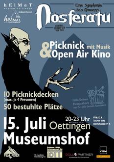 Beginn der Veranstaltung um 20 Uhr (Einlass ab 19:30 Uhr) mit Picknick im Museumshof. Füllen Sie Ihren Picknickkorb vor Ort mit Gretels Genüssen und lassen Sie sich von Klassikern der Filmmusik verwöhnen. Ab 21:30 Uhr wird der Stummfilmklassiker "Nosferatu - Eine Symphonie des Grauens" aus dem Jahr 1922 gezeigt, mit einer kurzen Einführung zur Geschichte des Films.